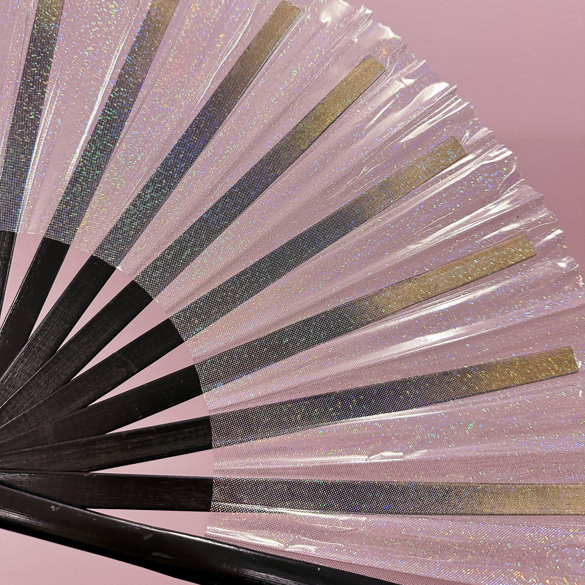 Giant Hand Fan With Black Bamboo Handle - Transparent Holographic Sparkle *SLIGHT SECONDS*