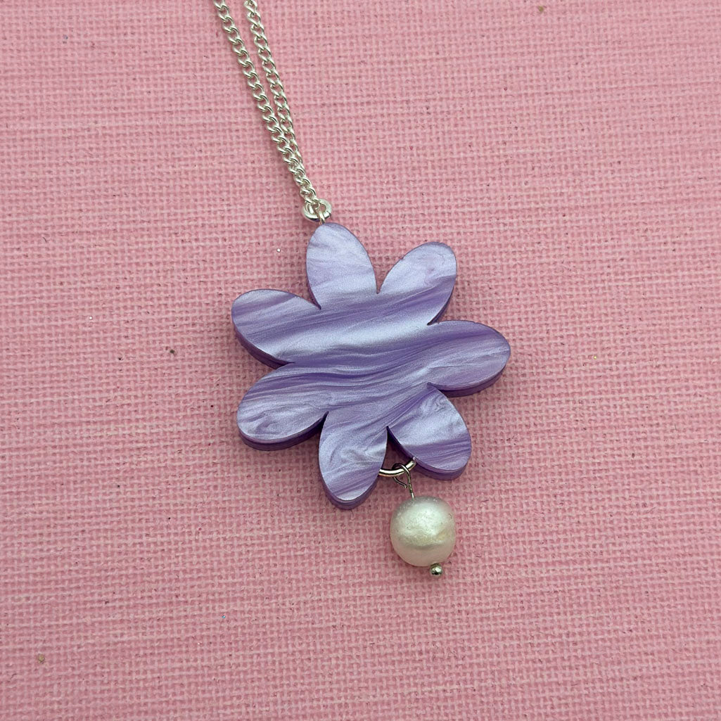 Handcrafted flower necklace made from gorgeous lilac pearlescent acrylic, with a real freshwater pearl bead.