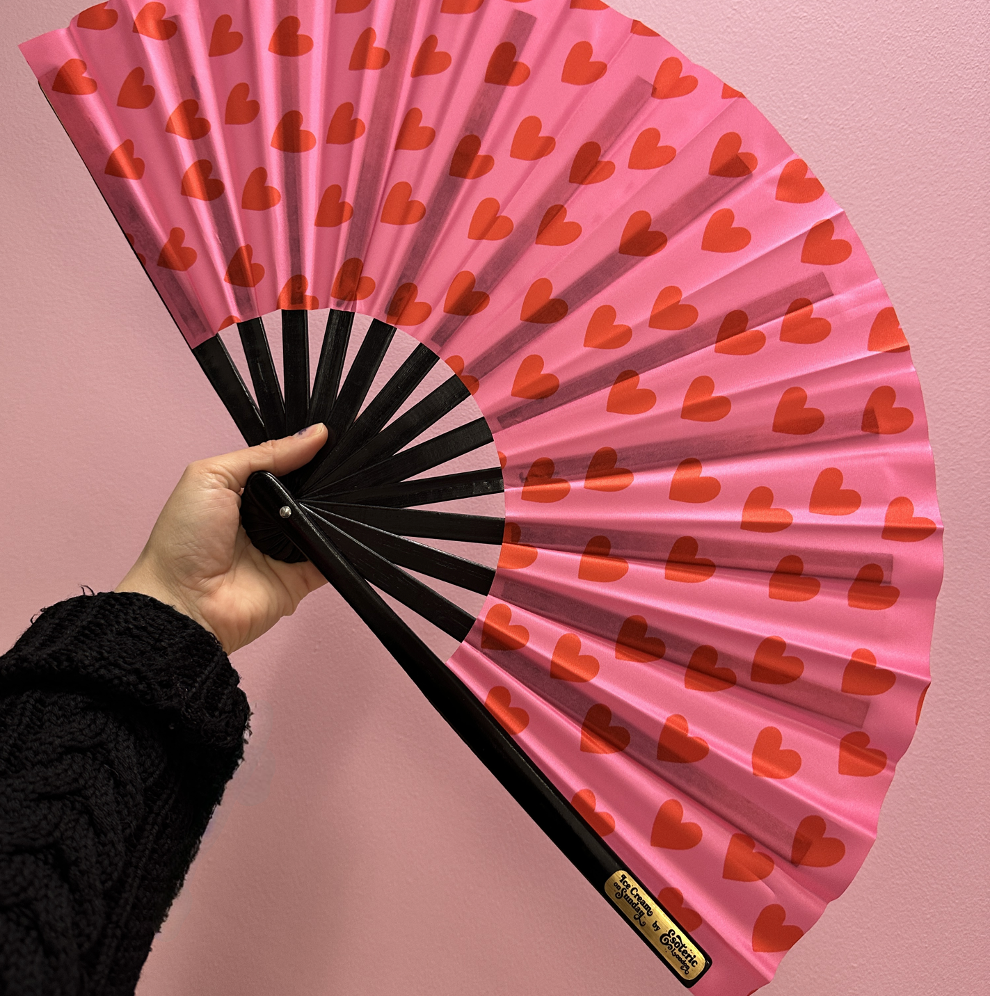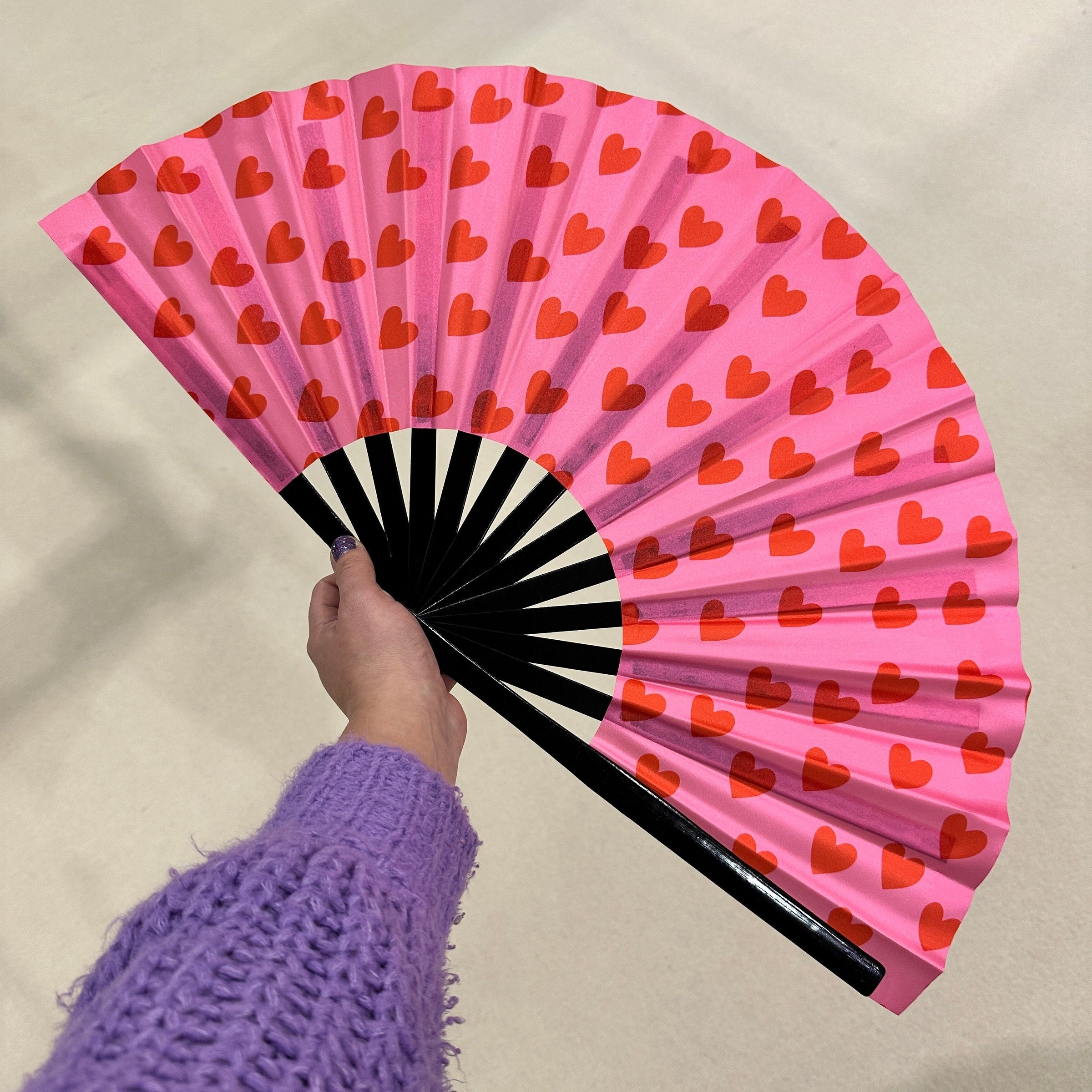 Giant Clacking Hand Fan with Pink & Red Hearts Print (Glows in UV!)