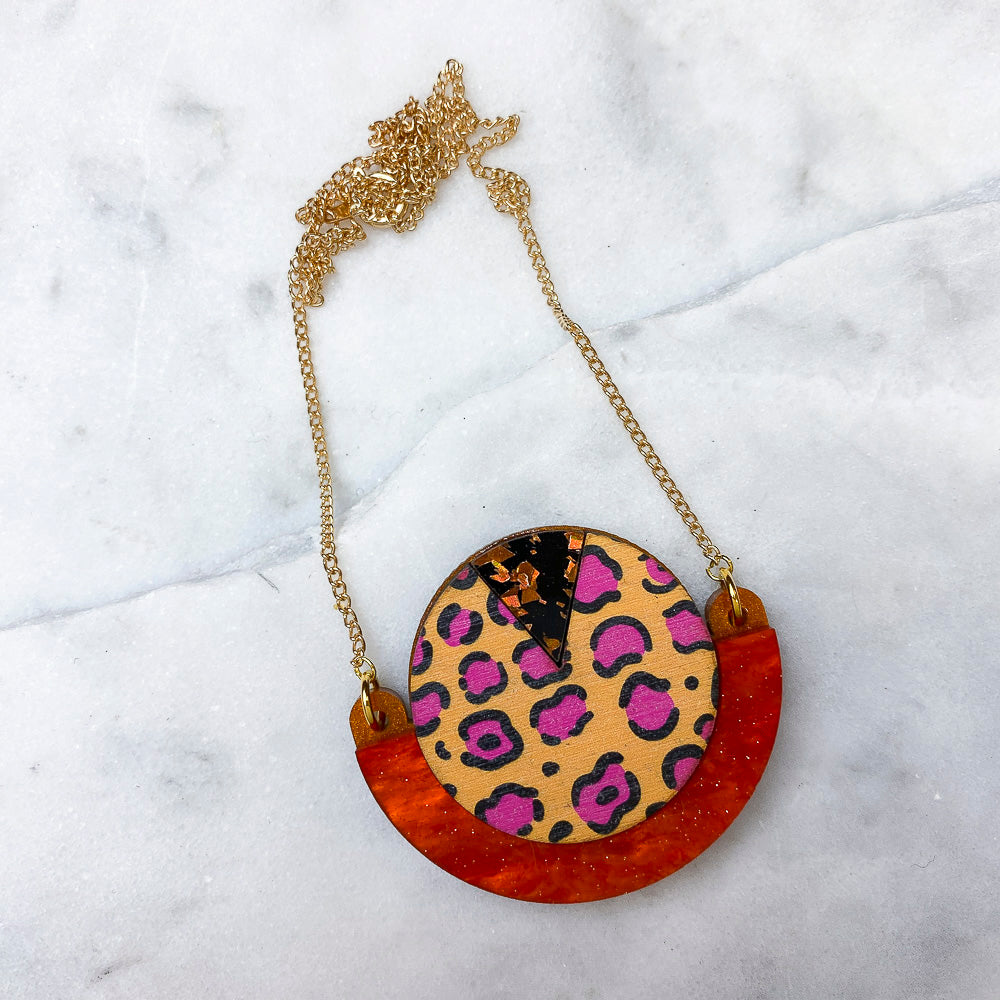 Bring an 80s glamour to your look with the Wild round pendant necklace, which features a funky animal print, trimmed with shimmering acrylic details.