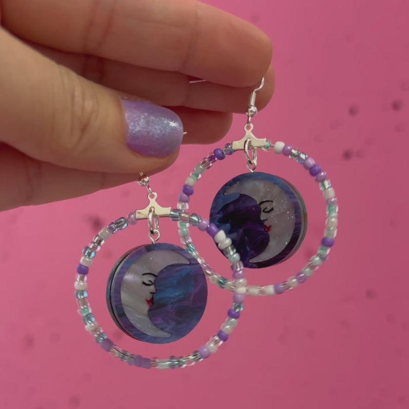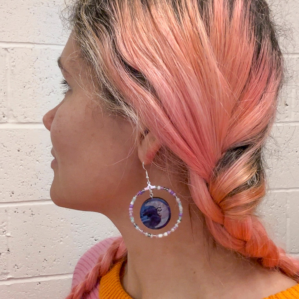 Handcrafted Moon Beaded Hoop Earrings, made from hand inked acrylic and iridescent glass crystals. The design is on both sides so they still look amazing as they swish around.