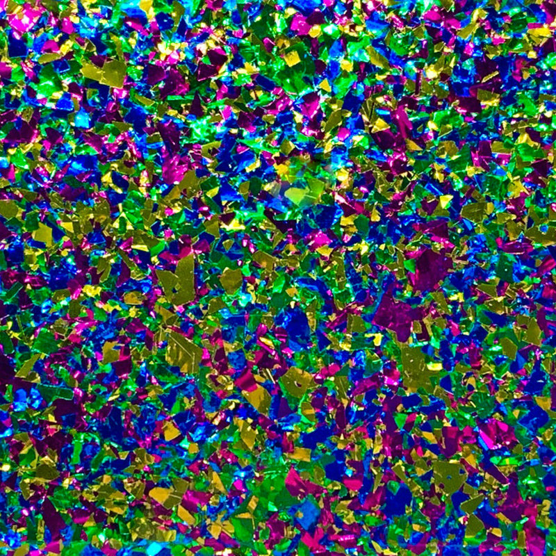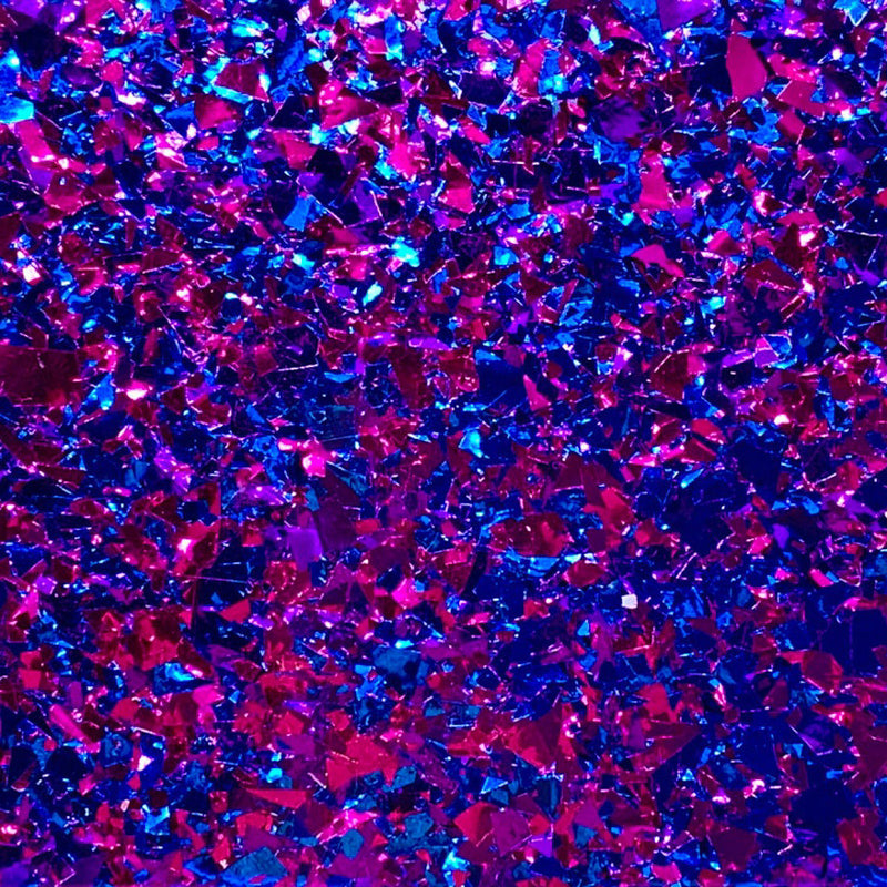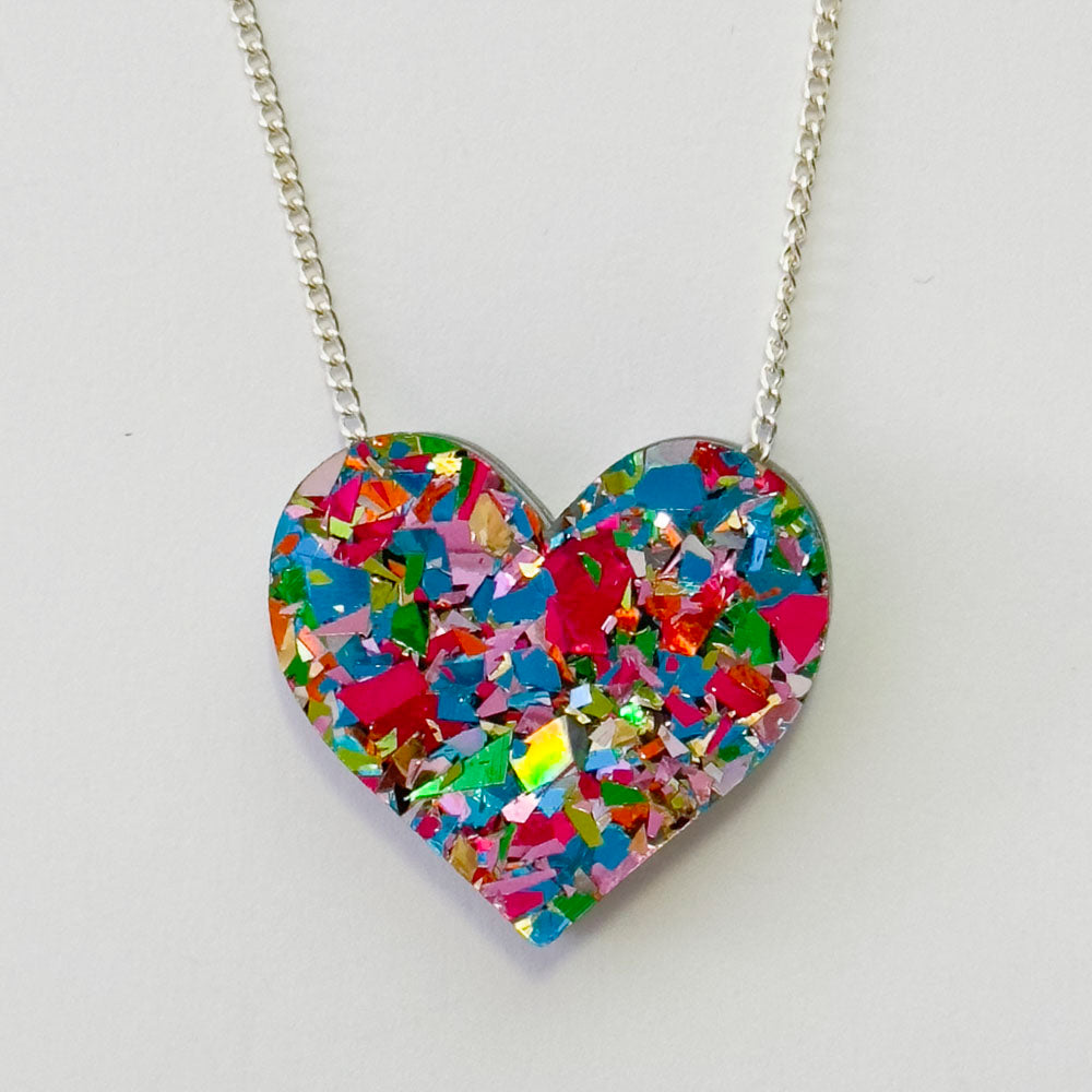 This simple reversible heart-shaped necklace is made from a dazzling confetti acrylic on one side and a fine shimmery glitter on the other.
