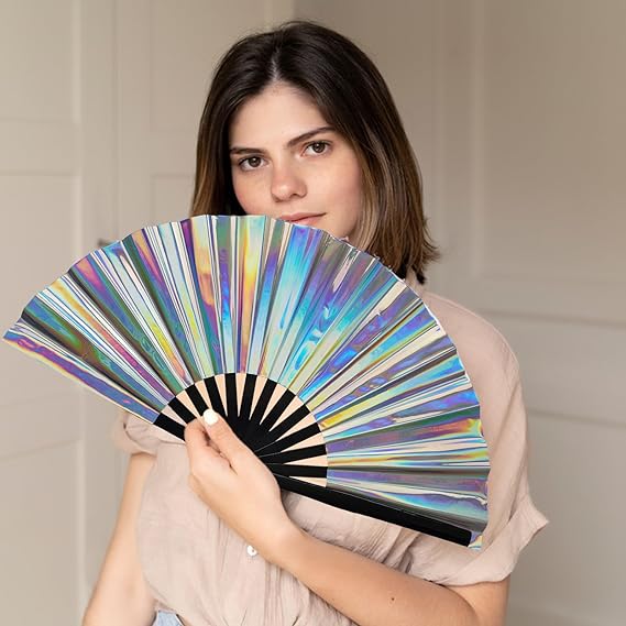 The perfect accessory for posing, performing, and looking fabulous: a giant hand fan with a black bamboo handle and iridescent shimmer. This statement piece will turn heads on the dance floor and keep you cool with its reflective, holographic silver surface.