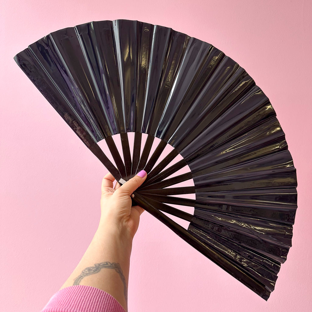 The perfect accessory for posing, performing, and looking fabulous: a giant hand fan with a black bamboo handle and shiny metallic finish. This statement piece will turn heads on the dance floor and keep you cool.