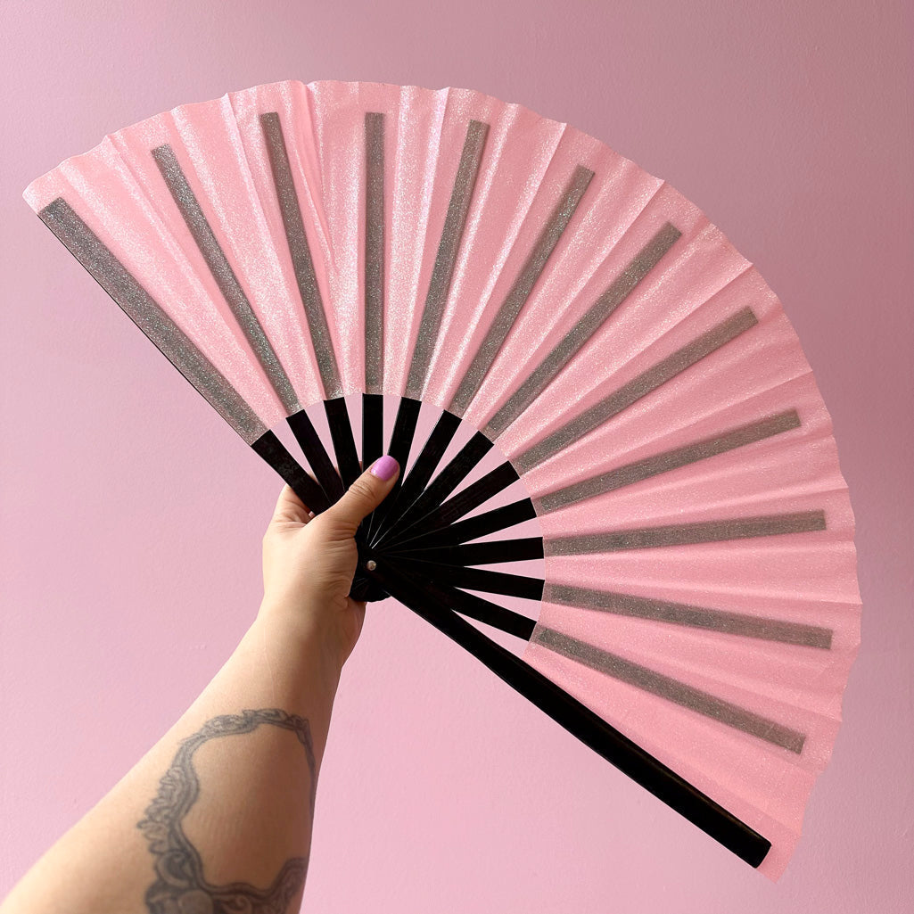 A giant statement glitter fabric hand fan with a black painted wooden bamboo handle. Perfect for posing, performing and just generally being fabulous. A Giant Hand Fan that's both stylish and statement-making! Perfect for turning heads and keeping cool out on the dance floor. Choose from lots of bold shiny colours.