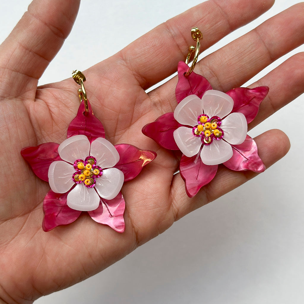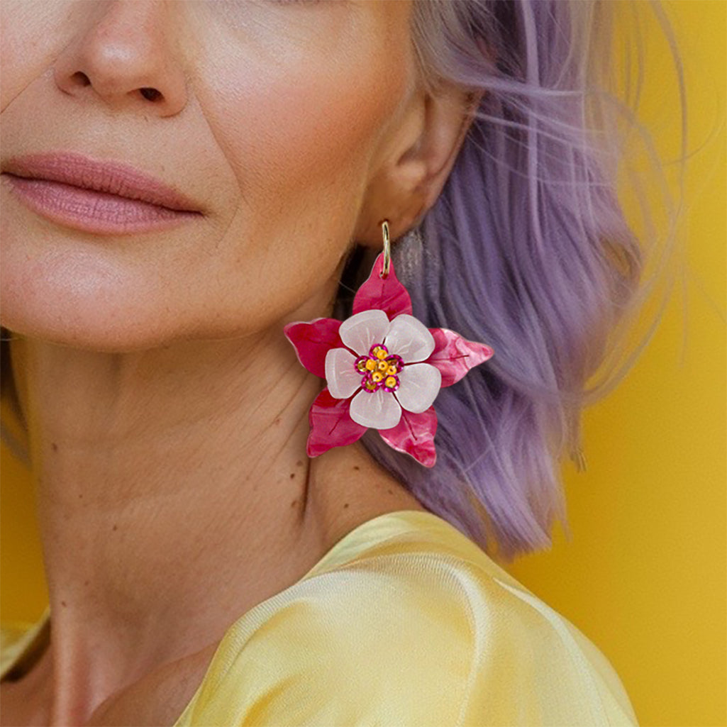 Columbine Flower Statement Dangle Earrings - Fuchsia