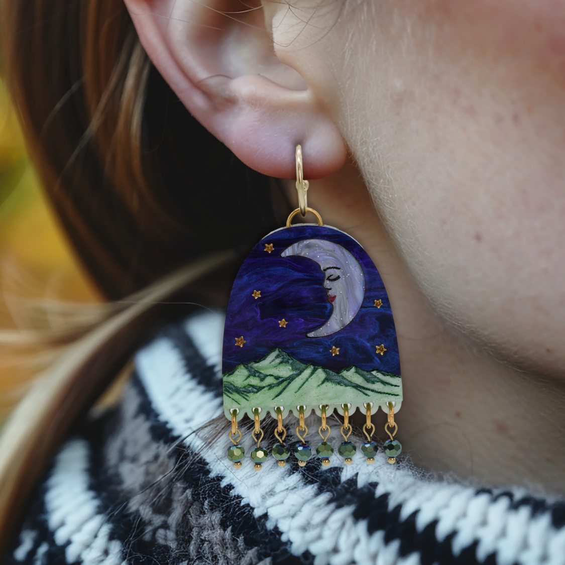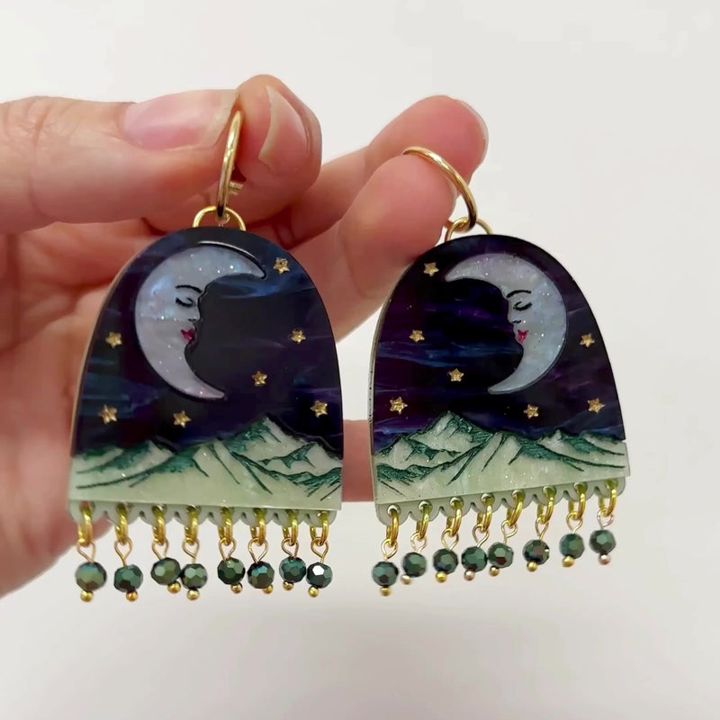 Handcrafted Moon Mountain Beaded Arch Hoop Statement Earrings, made from hand inked acrylic and iridescent glass crystals.