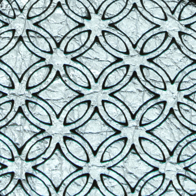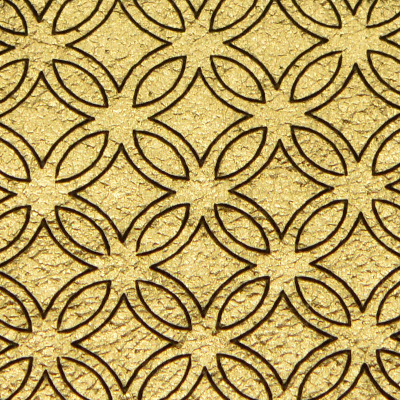 This geometric necklace is made of rich walnut wood inlayed with intricately etched metallic leather.