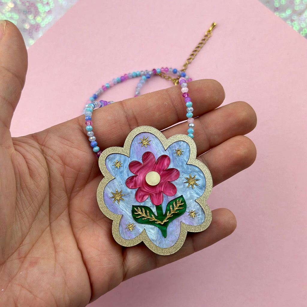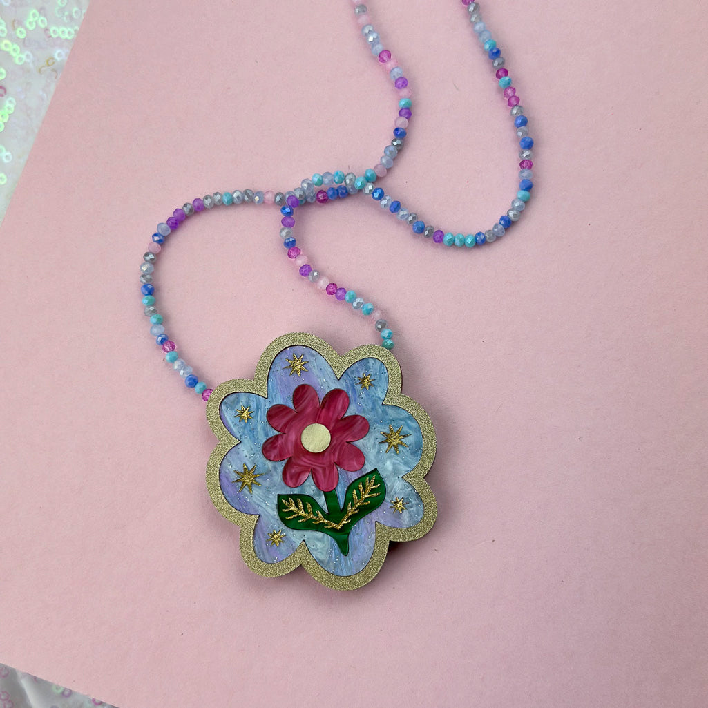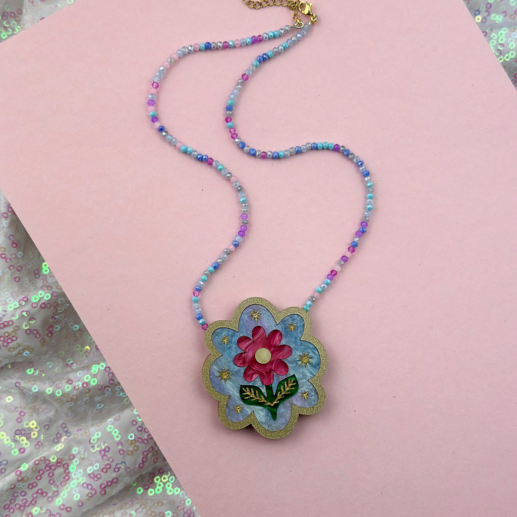 This charming heirloom piece features an inlaid daisy design made from glittering blue, and marbled pink and green acrylic, with a shimmering golden border and reverse. This necklace perfectly complements the earrings from the same collection for a cute matching set. Lightweight and stylish, this necklace is perfect for adding a playful, vintage vibe to any outfit. The faceted glass beaded chain that adds a touch of colourful elegance.