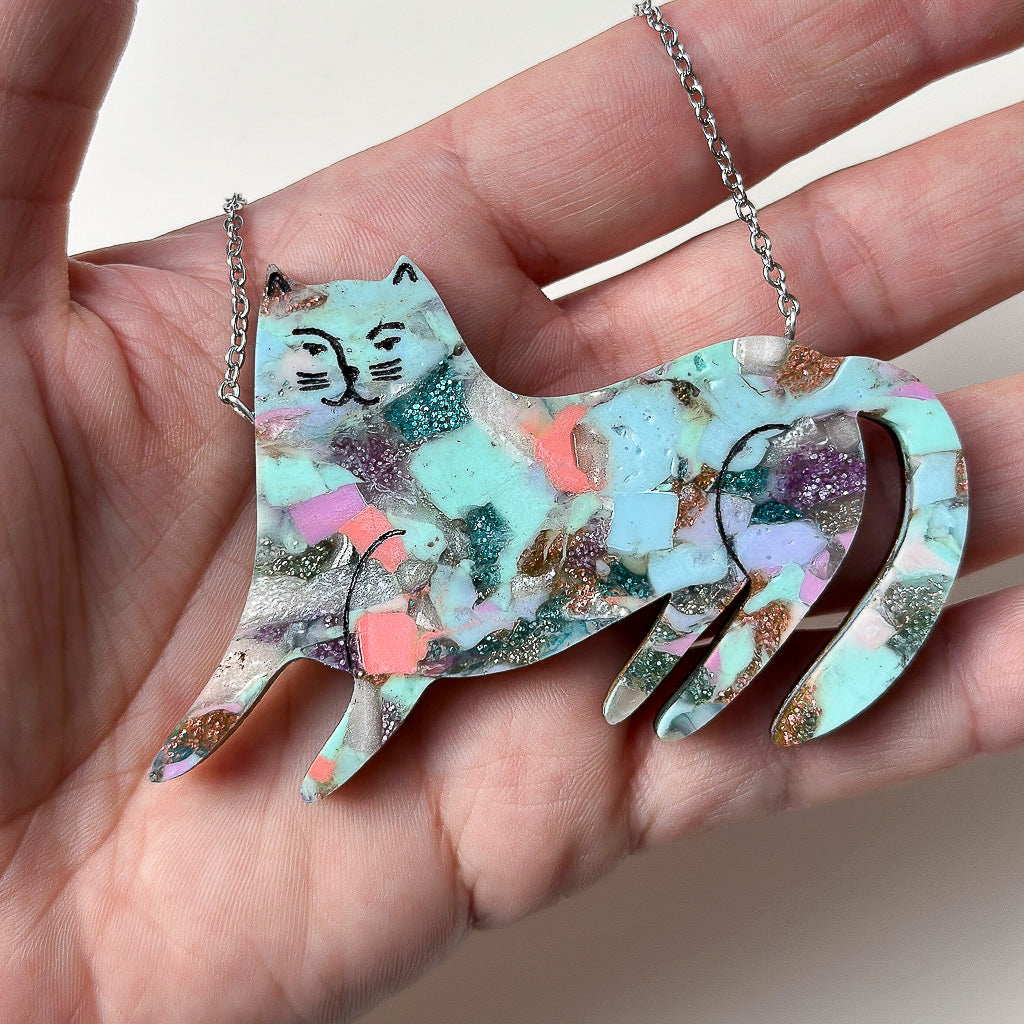 We start by shredding the acrylic offcuts, then hand-mix the bits to make gorgeous colour combinations, and then manually heat-press them until they fuse together. Then the shapes are laser cut to make completely unique pieces with different patterns on each and every one! What’s even better is that after we’ve cut out the new designs, we can RE-recycle those offcuts all over again so not a scrap is wasted!
