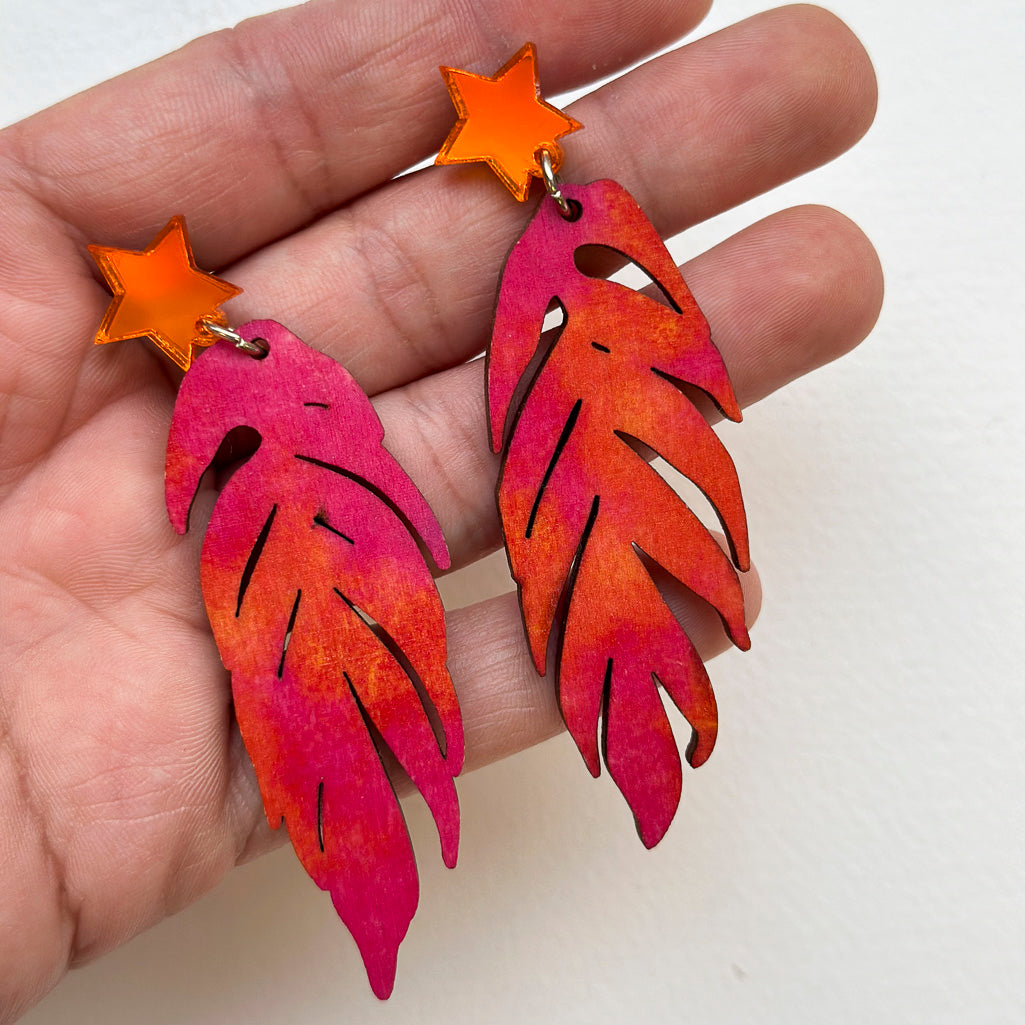 Tie Dye Leaf Printed Wooden Dangle Earrings