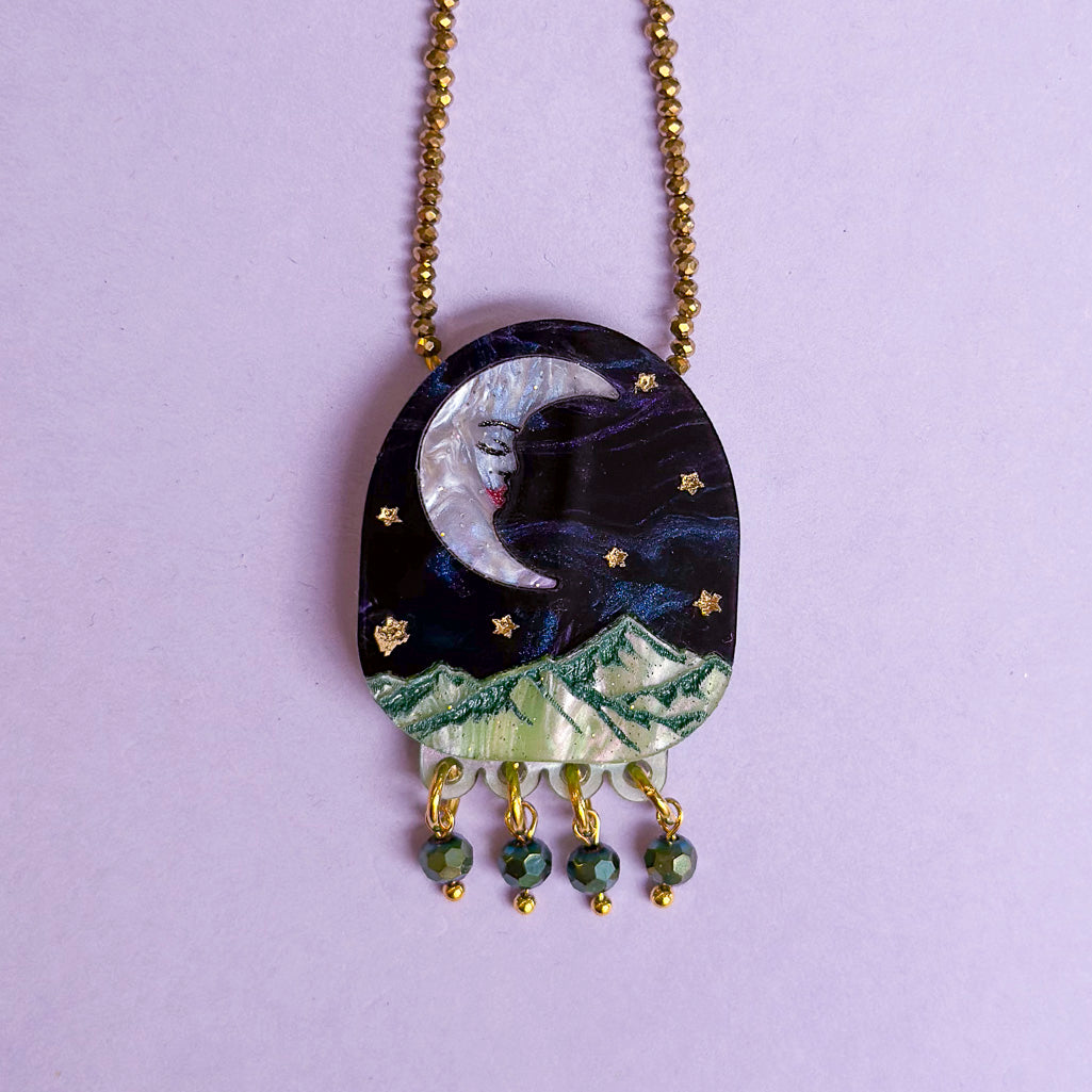 Introducing the one-of-a-kind Moon Mountain Beaded Pendant Necklace, lovingly handcrafted with a playful mix of hand inked acrylic and glass beads!