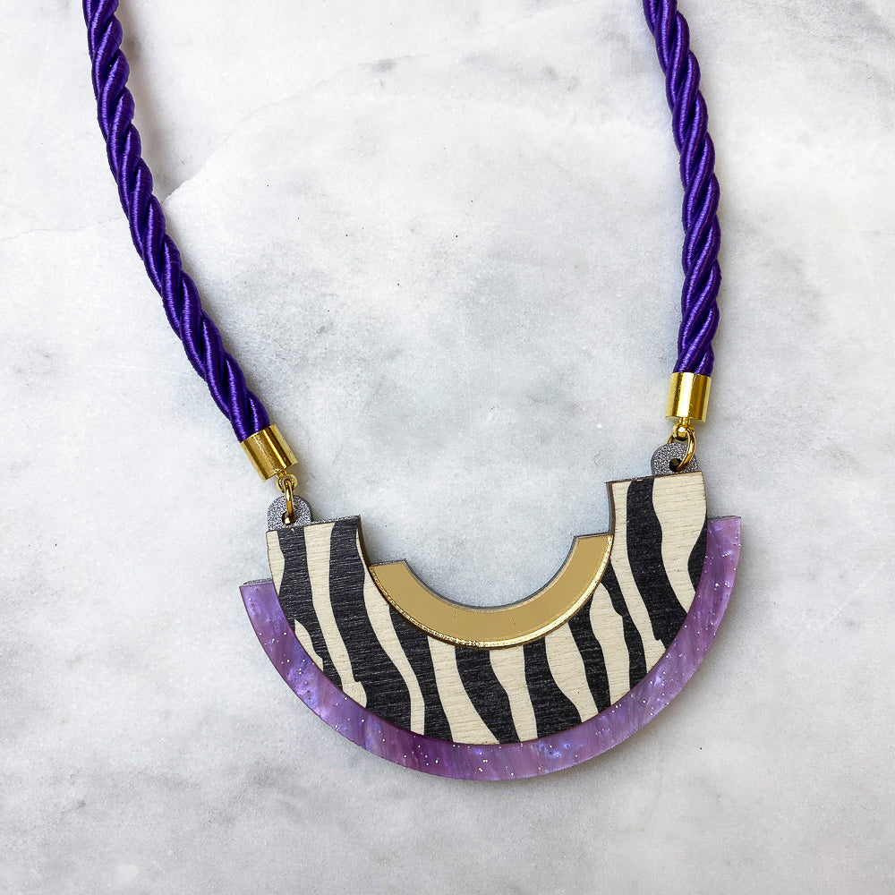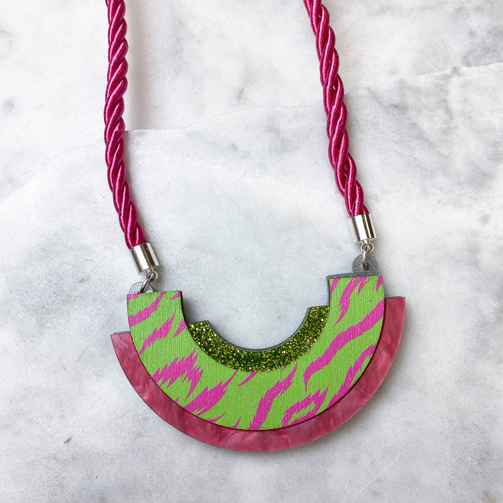 Bring a bit of graphic 1980s electro-pop style to your look with the Wild statement necklace, which features a bold animal print trimmed with sparkling acrylic details.