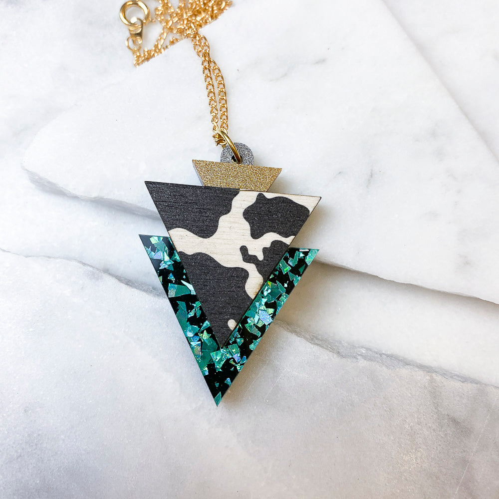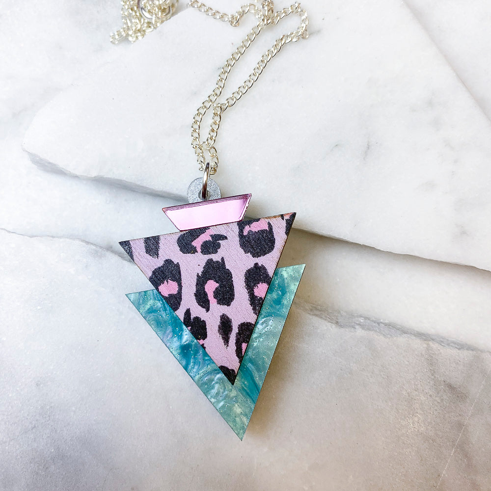 Bring a bit of 1980s glamour to your look with the Wild triangle pendant necklace, which features a funky animal print, trimmed with shimmering acrylic details.